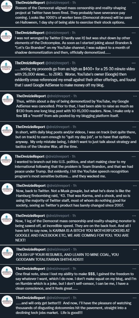 I fear that IF (and that’s a big “IF” considering Musk’s previous lies and cons!) Musk sticks to his promise of restoring free speech for all, that Twitter as a whole will get demonetised and that there won’t be any money in it for independent content creators just like there is no money on Rumble, Bitchute, Parler, Substack, Gettr, SuperU, Odysee and all those other sites. If freedom of speech will be restored, all the Blue Check Marks will leave, depriving Twitter off their ‘credibility,’ and they’ll start a massive campaign to label anybody remaining on Twitter as a “rightwing conspiracy nutcase.” Just like with Parler, advertisers will leave perhaps the Crapp Store/Goolag Play Store will remove the app, and all people who want to make content for a living are again forced to stick to YouTube/Fakebook and their leftwing biases and censorship.