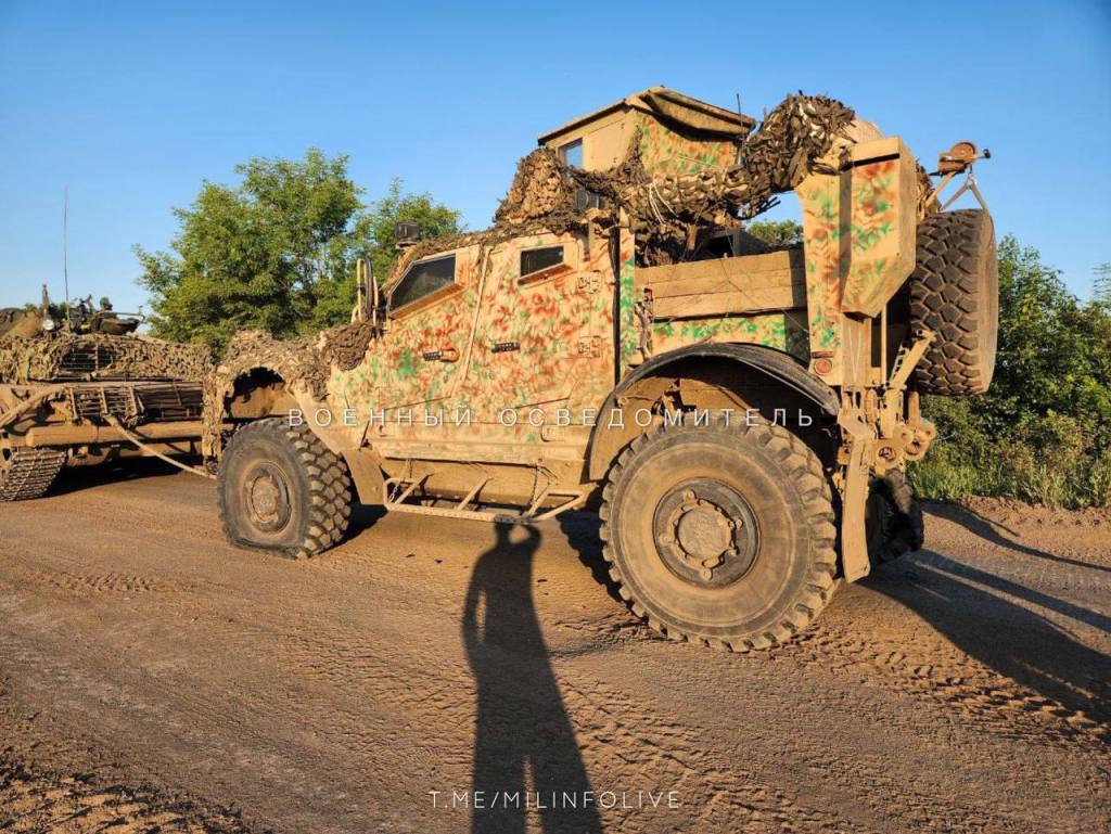 Below, a U.S. Oshkosh M-ATV MRAP, with a flat tire, captured by Russian marines, being towed away by a tank. Location unspecified, but most (if not all) marines are on the southern front.
