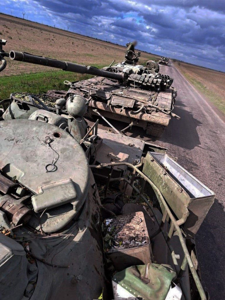 Below, a knocked-out Ukrainian tank, location unspecified.