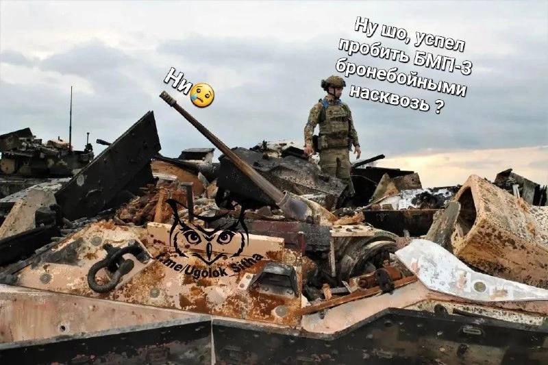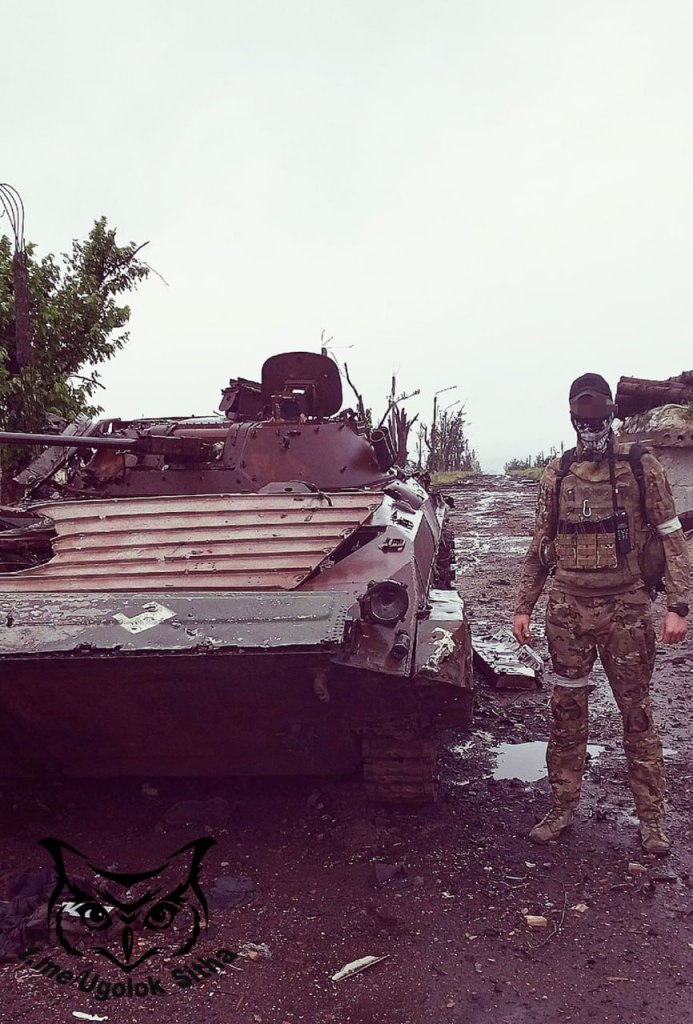 Below, a knocked-out Ukrainian BMP fighting vehicle, possibly near Bock-moot. The man in the photo is a Russian.